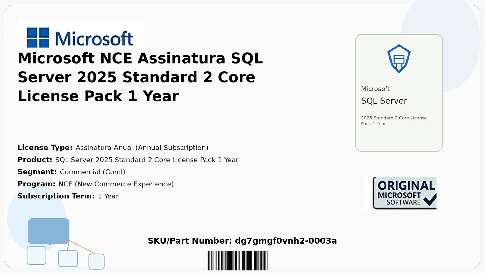 Compatível com o programa NCE (New Commerce Experience), que oferece boa flexibilidade na gestão de licenças. A versão 2025 traz melhorias em estabilidade e recursos para bancos de dados corporativos. A licença se aplica a 2 núcleos de processamento e é direcionada a ambientes que demandam alta confiabilidade e escalabilidade.