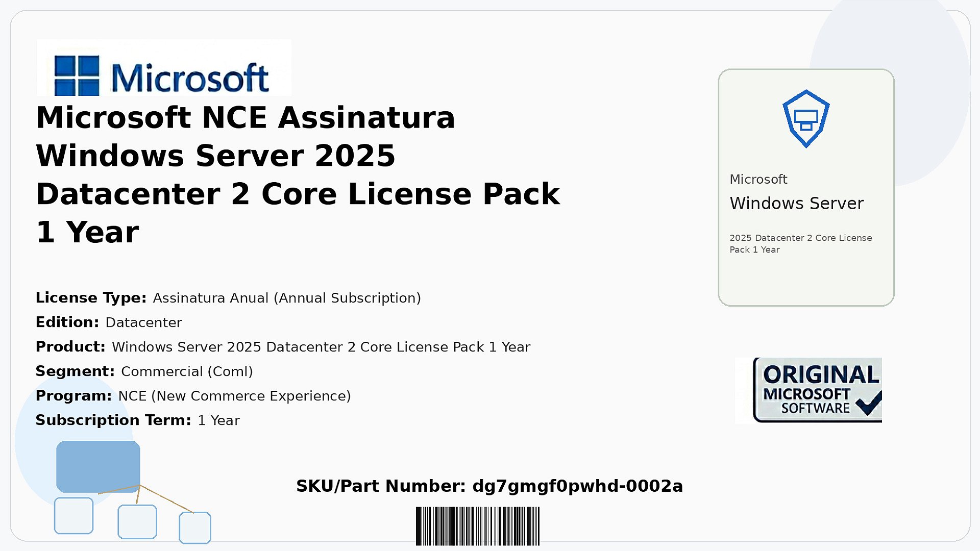 Licença anual para Windows Server 2025 Datacenter, com pacote de 2 cores para uso comercial. Ideal para empresas que precisam de servidores robustos e flexíveis.