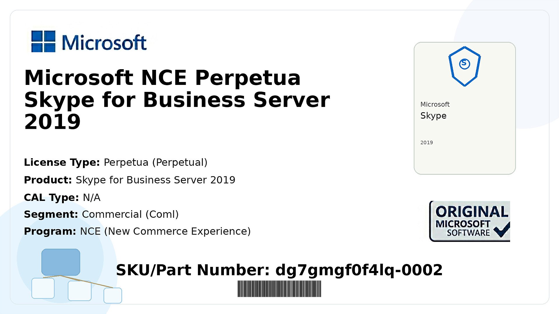Esta licença é para o modelo dg7gmgf0f4lq-0002 da Microsoft, versão 2019, software dedicado ao Skype for Business Server. O produto é comercial e atende empresas que buscam soluções robustas para comunicação interna e externa.