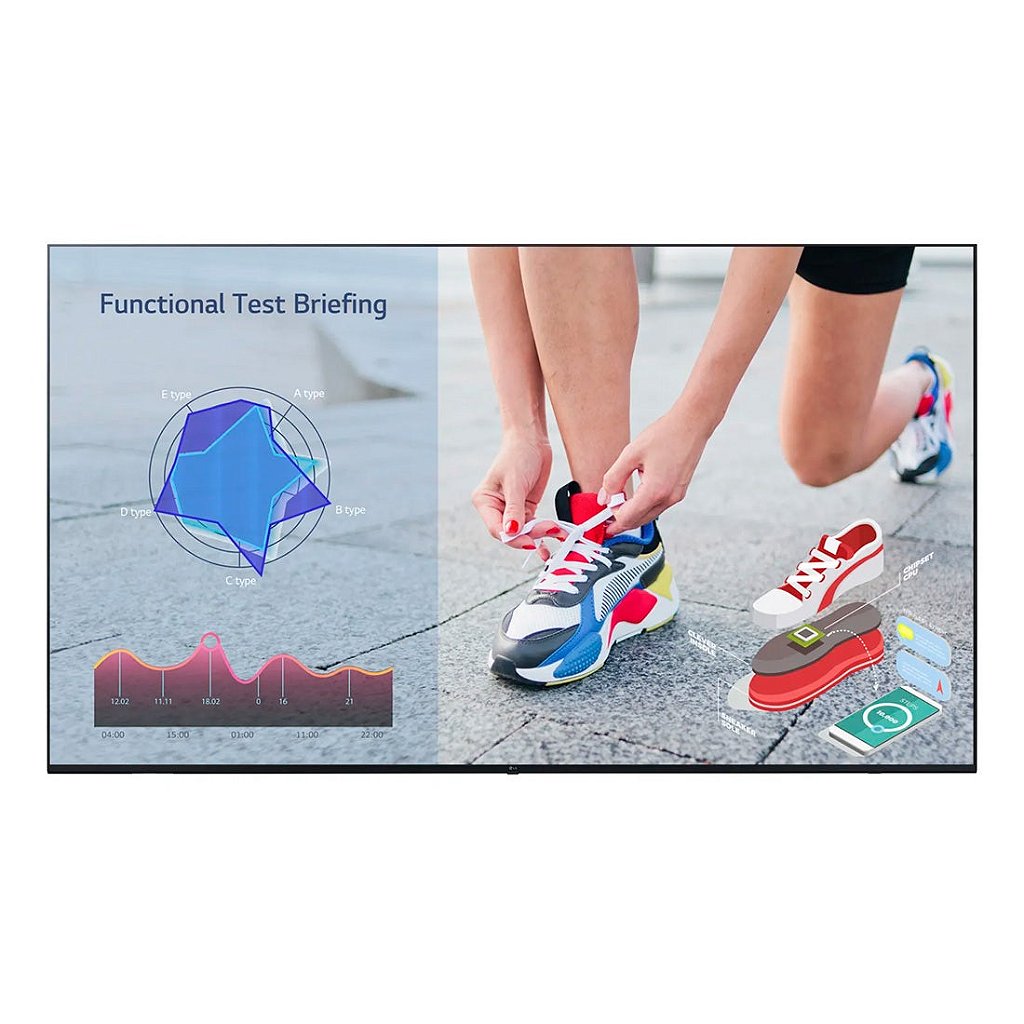 Hardware Memória interna 8 GB, Wi-Fi integrado, Sensor de Temperatura, Sensor de Brilho Automático, Operação de Tecla Local (Somente Liga/Desliga) Software WebOS ver. (webOS6.0), CMS incorporados (Programação de Conteúdo Local, Gerenciador de Grupo), USB Plug &Play, Fail over, Imagem de Fundo (Imagem do logotipo de inicialização, imagem sem sinal), modo de sincronização (RS-232C Sync, Sincronização de Rede Local), Compartilhamento de Tela, Tag de Vídeo (4, entrada Max One HDMI), Reprodução via URL, Rotação (Rotação de tela, rotação externa), reprodução sem lacunas, configuração de clonagem de dados, SNMP, ISM Auto Set ID, Status Mailing, Control Manager, 3rd Party Compatibilidade (Cisco certi), Crestron Connected), Power (Smart Energy Saving, MODO PM, Wake on LAN, Network Ready), Beacon, HDMI-CEC, SI Server Setting, webRTC, Pro:Idiom |
